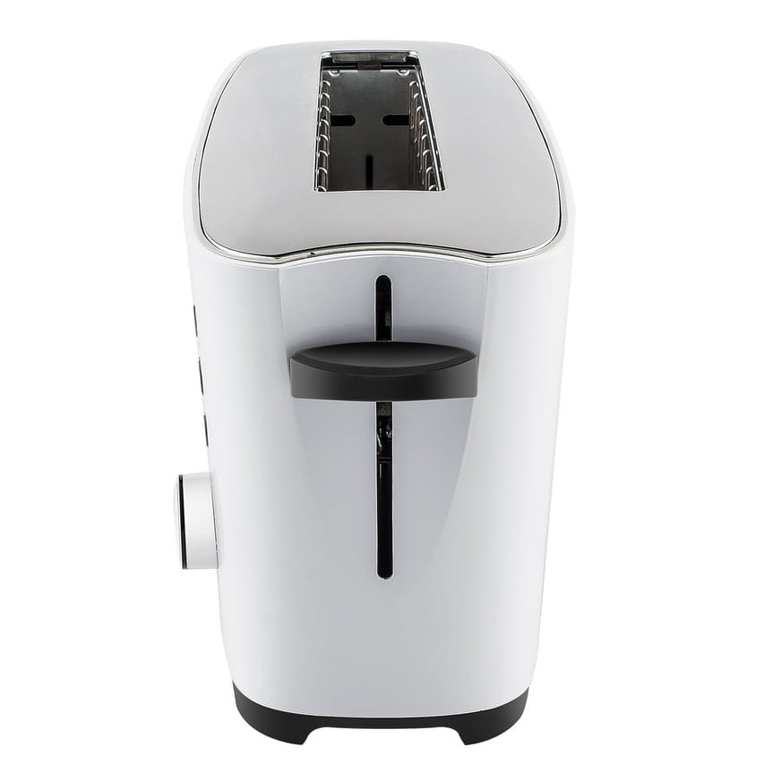 Tostadora blanca con ranura extragrande y funciones inteligentes. Ideal para rebanadas anchas, con control de tostado y limpieza rápida gracias a su bandeja extraíble.