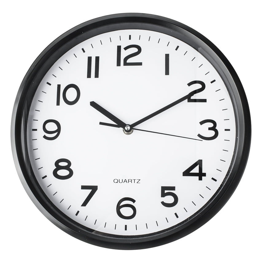Números y agujas en negro sobre fondo blanco, lectura clara a distancia.