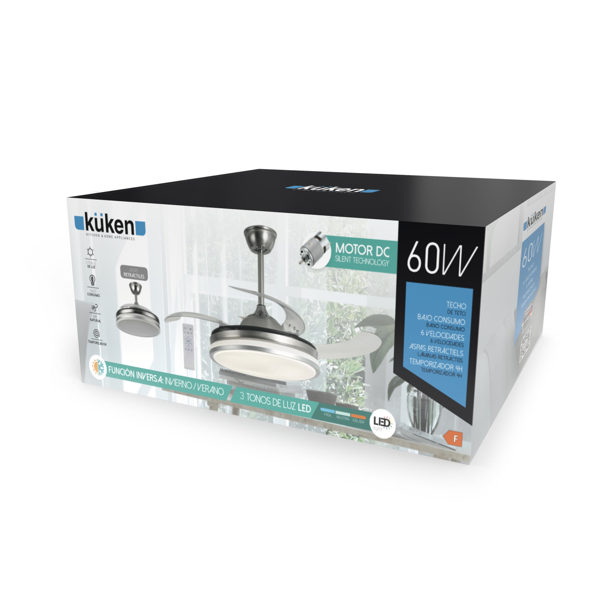 Combina ventilación eficiente y luz regulable. Con aspas retráctiles, motor silencioso y mando, este ventilador es ideal para usar todo el año con estilo y confort.