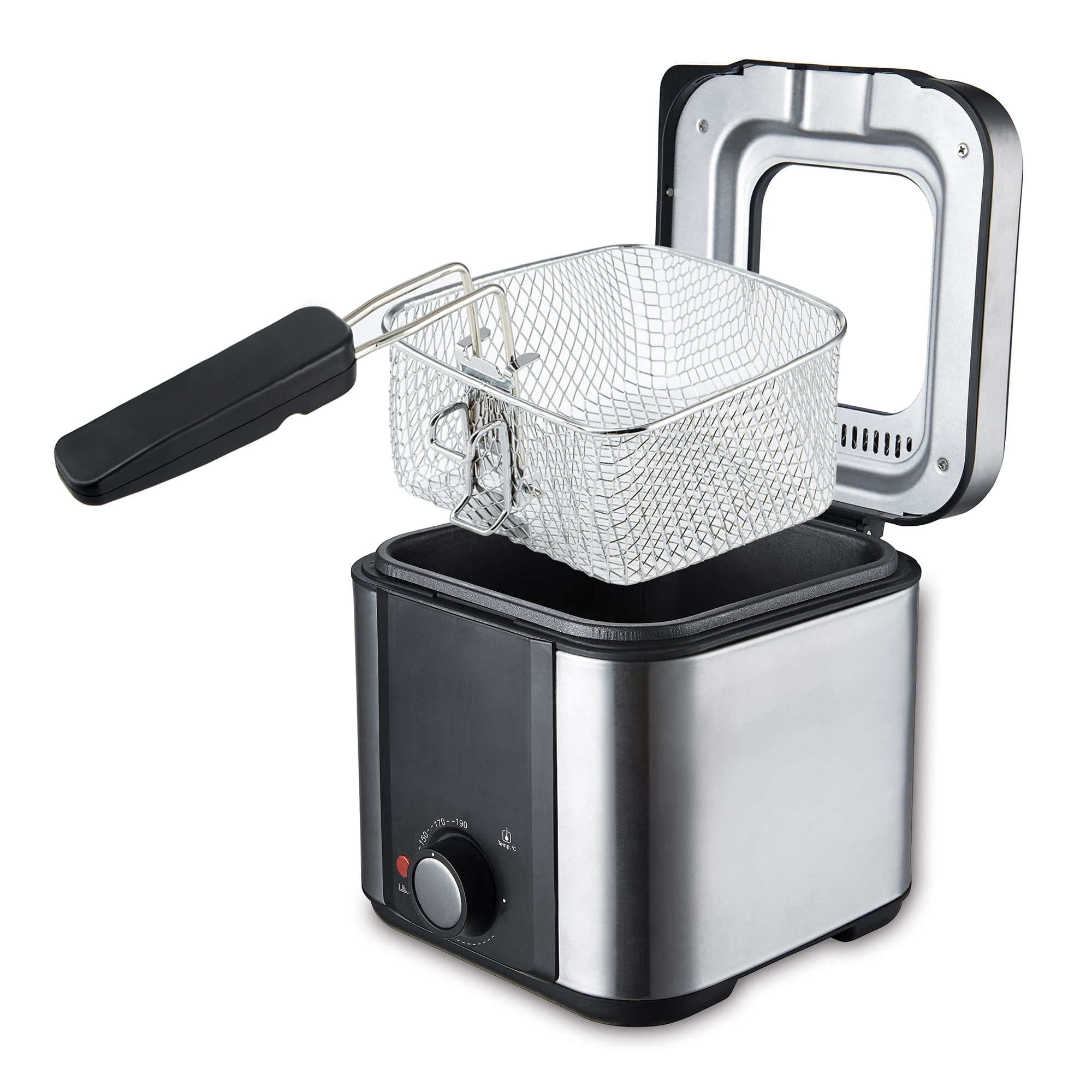 Freidora práctica y compacta con visor de cristal, control de temperatura y diseño en acero inox. Ideal para preparar frituras rápidas con total seguridad.